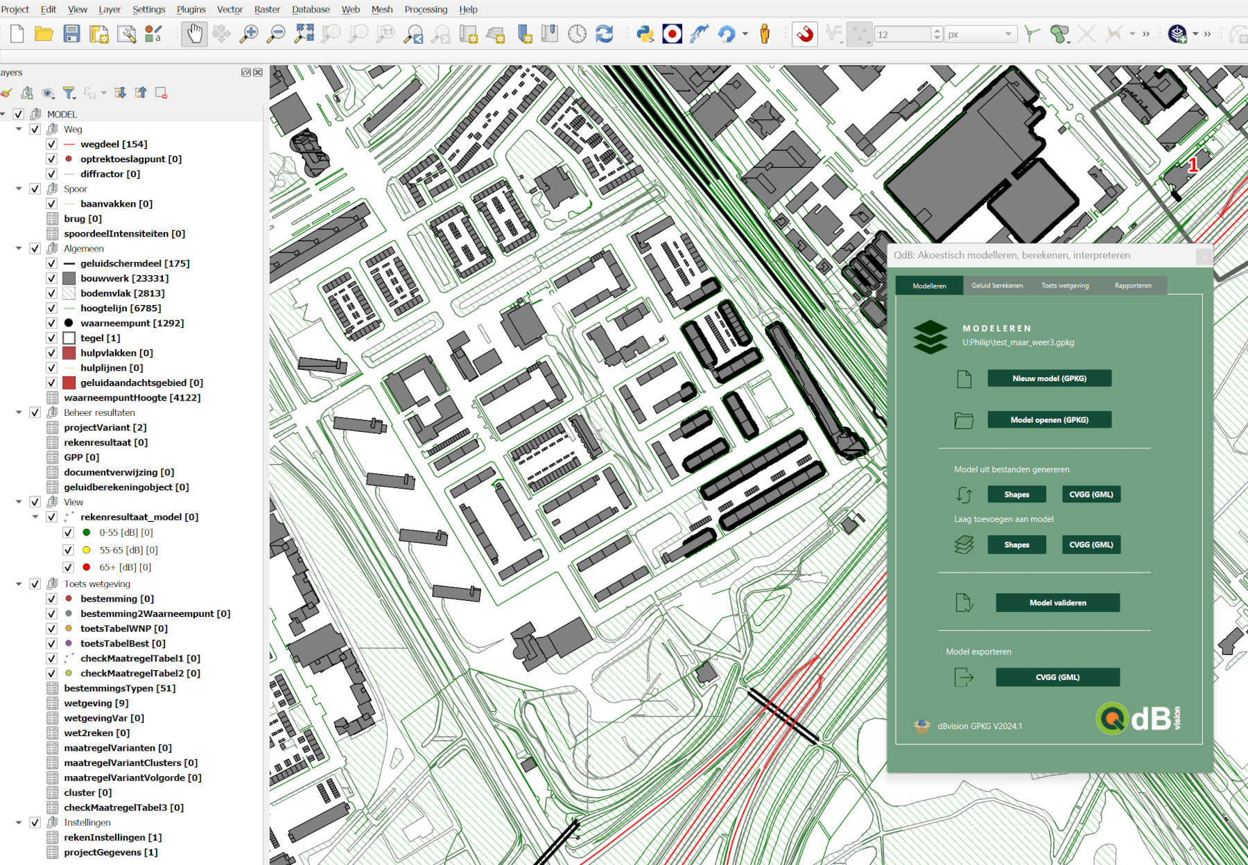Met QdB maak je je eigen geluidmodel in een volwaardige GIS omgeving (QGIS). Voor het berekenen van geluid maakt het gebruik van het RIVM rekenhart. Als de berekeningen klaar zijn worden de resultaten weggeschreven in de QdB database. Met QdB wissel je gegevens uit met het CVGG. In QdB zijn de geluidregels uit de Omgevingswet opgenomen. Rekenresultaten kan je daardoor direct toetsen aan de wettelijke regels.